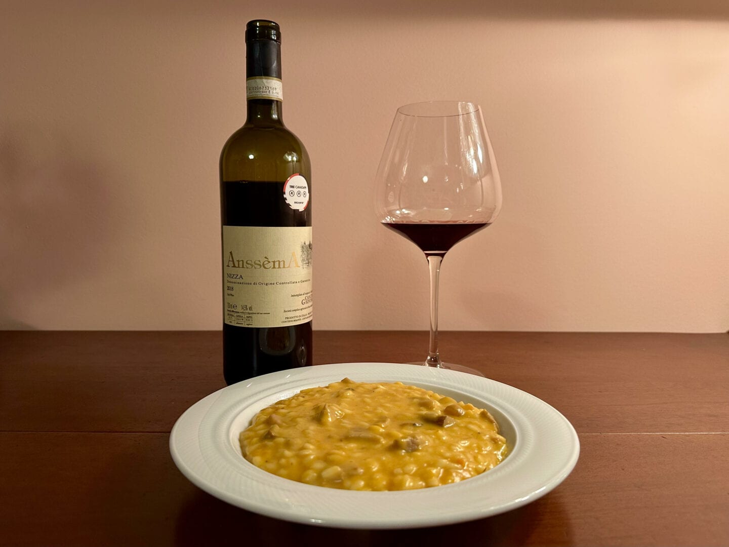 Noi abbiamo scelto un risotto con riso Carnaroli Classico alla crema di zucca castagna con Taleggio e funghi porcini, che si è rivelato una combinazione azzeccata. Infatti, la grassezza e la tendenza dolce del piatto sono perfettamente bilanciate dall’acidità e dalla sapidità del vino. Inoltre, l’intensità e la lunghezza di Anssèma compensano l’aromaticità e la persistenza gusto-olfattiva del risotto. Il risultato è un’armonia fra i contrasti, che valorizza sia la pietanza che la Barbera, lasciando la bocca perfettamente pulita. Ciò che rimane è la voglia di un’altra forchettata di riso, accompagnata da un ulteriore calice di vino.