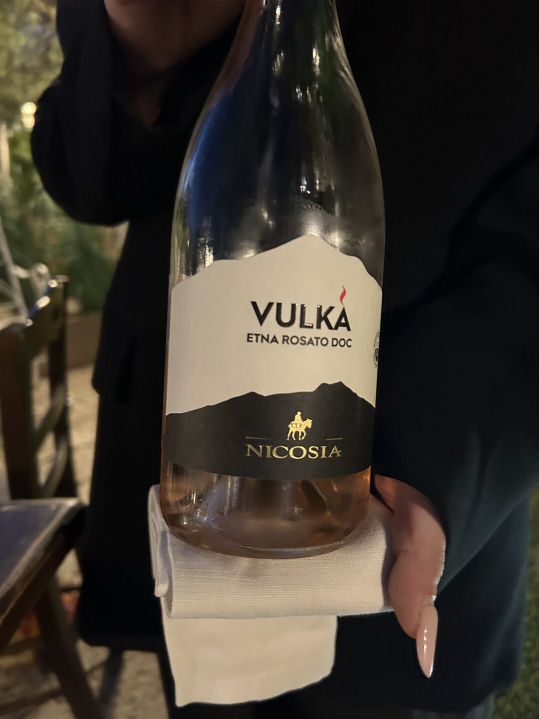 Il primo vino, abbinato all’antipasto, è un Nerello Mascalese rosato in purezza , coltivato su suoli vulcanici ricchi di minerali tra i 650 e i 750 metri sull’Etna. Il clima, con forti escursioni termiche, esalta aromi e freschezza naturale. La vendemmia manuale, a inizio ottobre, preserva l’integrità dei grappoli. Dopo una breve macerazione e pressatura soffice, il mosto fermenta lentamente a temperatura controllata. L’affinamento avviene in acciaio inox e prosegue con tre mesi in bottiglia, per un vino armonico e autentico.