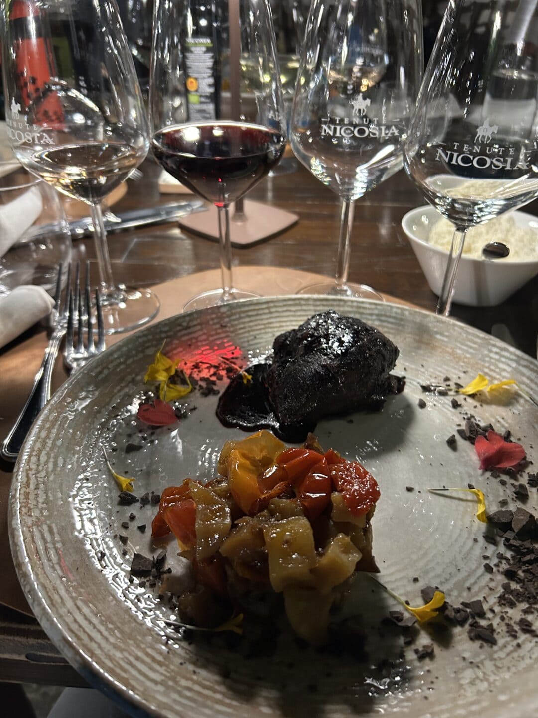 Chiara, come un direttore d’orchestra, conduce la degustazione con gesti sicuri, accostando sapientemente quattro vini a piatti selezionati con cura. Otto calici in totale in due persone, che hanno saputo raccontare, ognuno a modo proprio, l’anima profonda dell’Etna e della cantina.