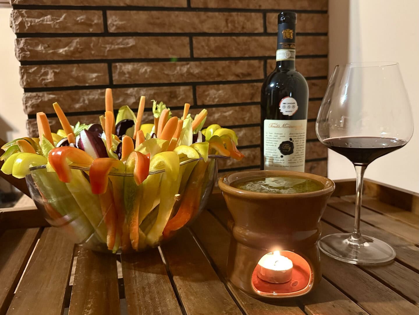Nel nostro caso, la scelta è ricaduta su un abbinamento tipico della tradizione con un piatto molto antico: la bagna cauda. Il connubio fra sapidità, aromaticità, untuosità della salsa e freschezza, persistenza, struttura calda e avvolgente del vino regala sensazioni estremamente appaganti, donando un vero e proprio senso di incastro perfetto.