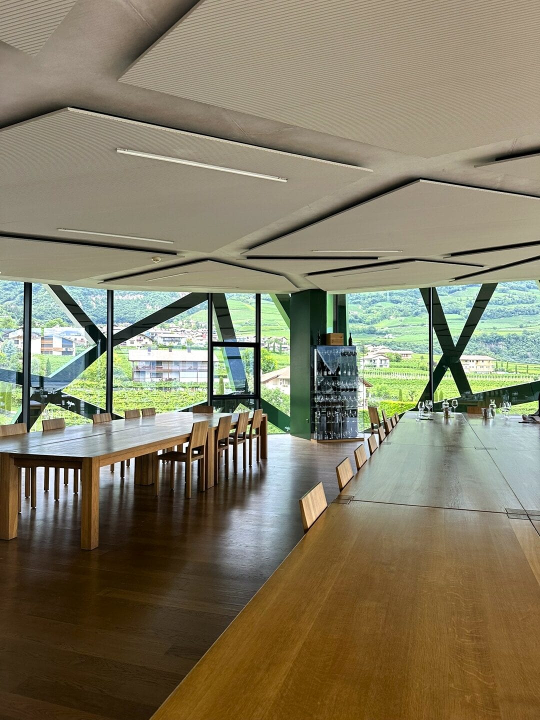 L’architettura della Cantina Tramin è un manifesto contemporaneo ispirato alla vite, che porta la firma di Werner Tscholl: un intreccio scultoreo che “nasce” dal terreno e abbraccia l’edificio come un tralcio, filtrando luce e ombre durante il giorno e diventando segno luminoso al tramonto.