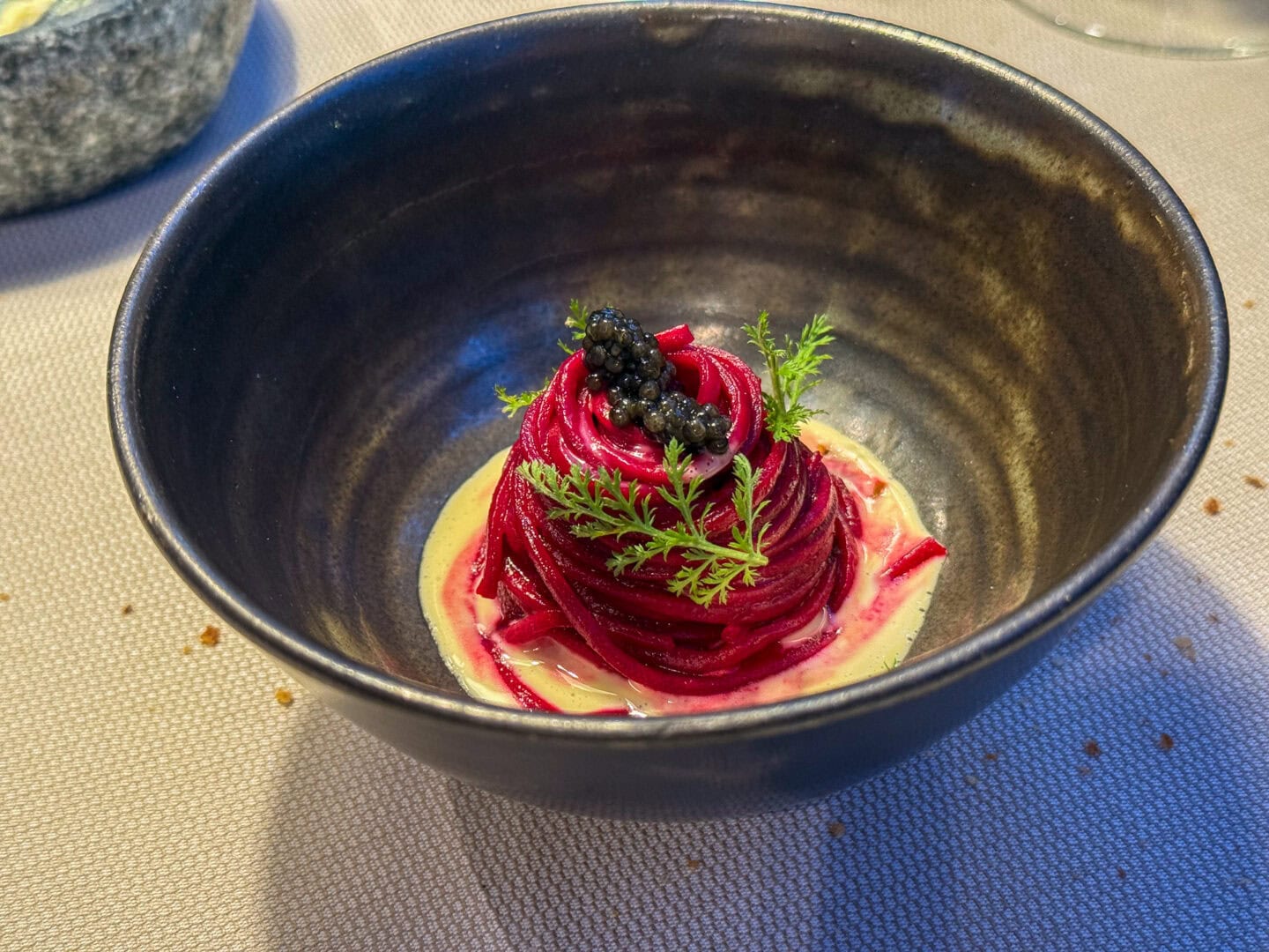 - Spaghetto alle rape rosse con crema di lievito caramellarto e achillea