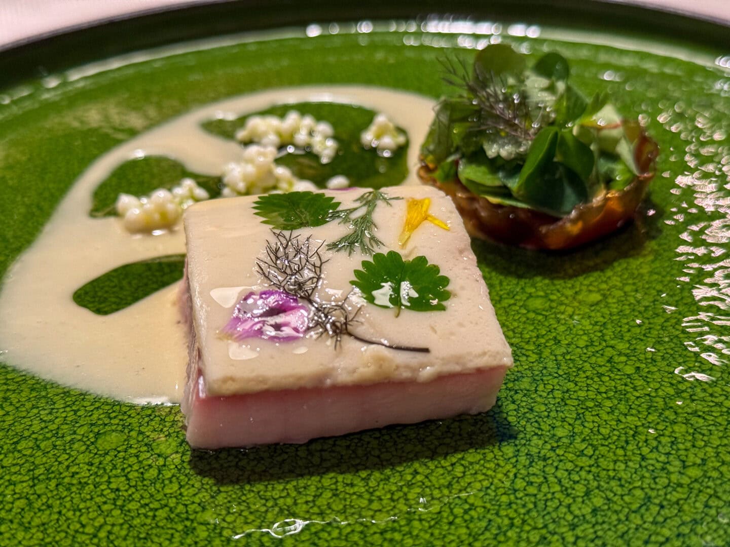 - Salmerino con infusione bianca alla melissa, olio all’erba di grano e cartelletta gelificata con erbe spontanee